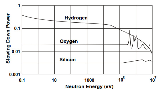 Efficiency of hydrogen, silicon, and oxygen atoms in slowing down fast neutrons in a clean sandstone (φ = 0.15).